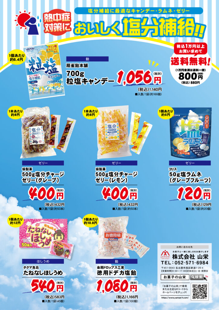 2025.05.26 「熱中症対策商品を始めました」 2025年6月より熱中症対策が義務化されたことを受け、弊社は手軽に水分・塩分を補給できる「熱中症対策お菓子」の販売を始めました。塩分入りキャンディやタブレット、ミネラルを豊富に含んだゼリーなど、暑い季節でも美味しく食べられるよう工夫された商品です。お子さまから高齢の方まで安心して召し上がっていただけるよう、味や品質にもこだわっております。 FAX注文書にてご注文いただけます。 FAX注文書ダウンロード 一覧へ戻る
